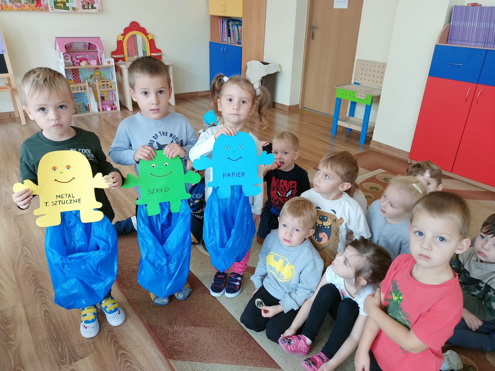 Dzieci na zajęciach uczyły się jak dbać o nasze otoczenie i z ogromnym zaangażowaniem segregowały śmieci i wrzucały je do odpowiednich worków, utrwalając przy tym kolory pojemników na śmieci i kształtując postawę proekologiczną.