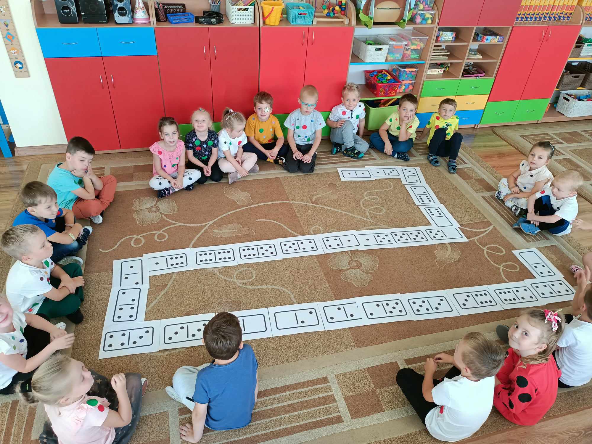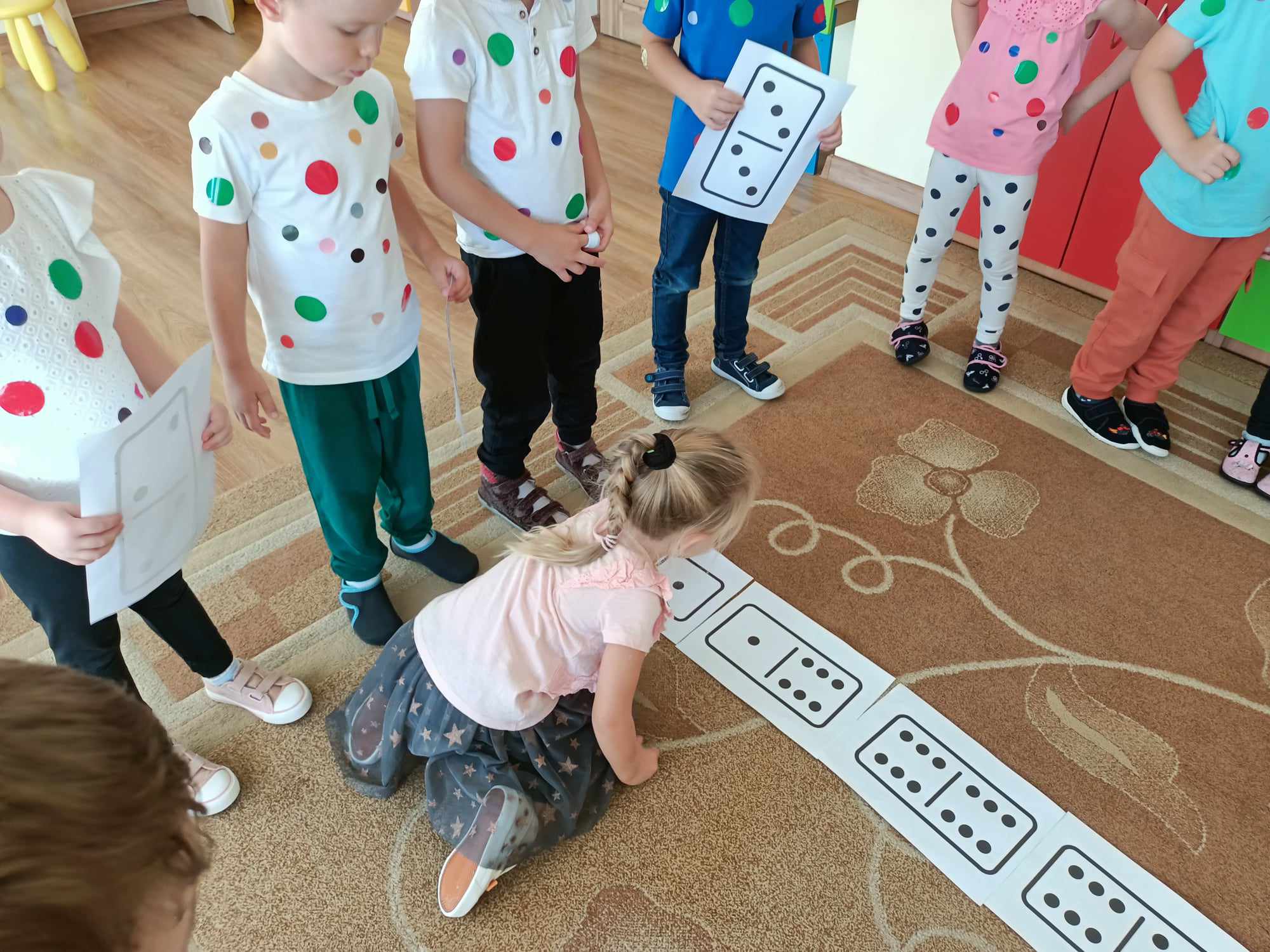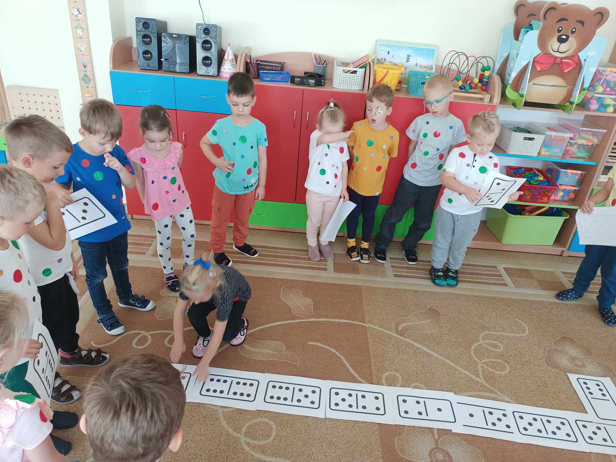 Celem Międzynarodowego Dnia Kropki jest wzbudzenie u dzieci kreatywności, pomysłowości i zachęcenie ich do tworzenia, działania. Dzień Kropki jest to dzień odwagi i zabawy. Tego dnia nasze zabawy wypełnione były kolorowymi kropkami, Dzieci dostrzegły, że świat składa się z kropek małych i dużych. Kropki gościły w zabawach ruchowych jak i matematycznych -domino dywanowe. Dzieci układały kropki na sylwetce biedronek Wykonały kompozycje z kółek różnej wielkości i koloru rozwijając przy tym swoje twórcze myślenie i kreatywność. Na zakończenie każde dziecko otrzymało order uśmiechniętej kropki oraz wykonało sobie pamiątkowe zdjęcie Tego dnia było bardzo kolorowo i wesoło.