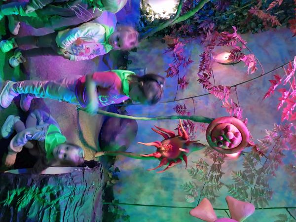 Następnie trafiamy do Czarodziejskiego Ogrodu. I znów jesteśmy mali… Świecące latarnie mają kształt leśnych konwalii. Wielkie, granatowe jagody są miękkie, jakby były wypełnione gąbką. Pośród magicznych roślin możemy znaleźć „gadające kamienie” i spotkać Calineczkę śpiącą w kielichu kwiatu.