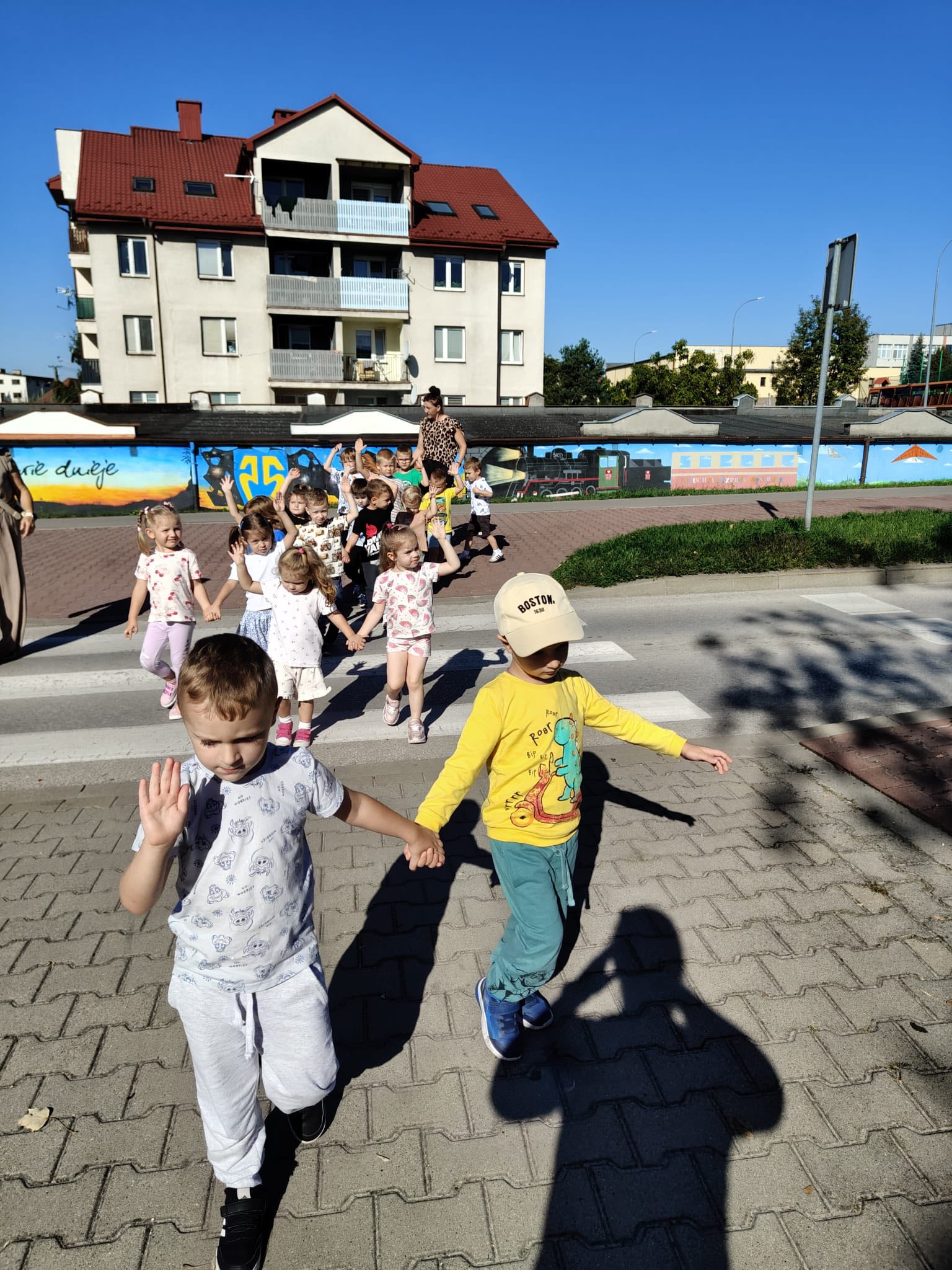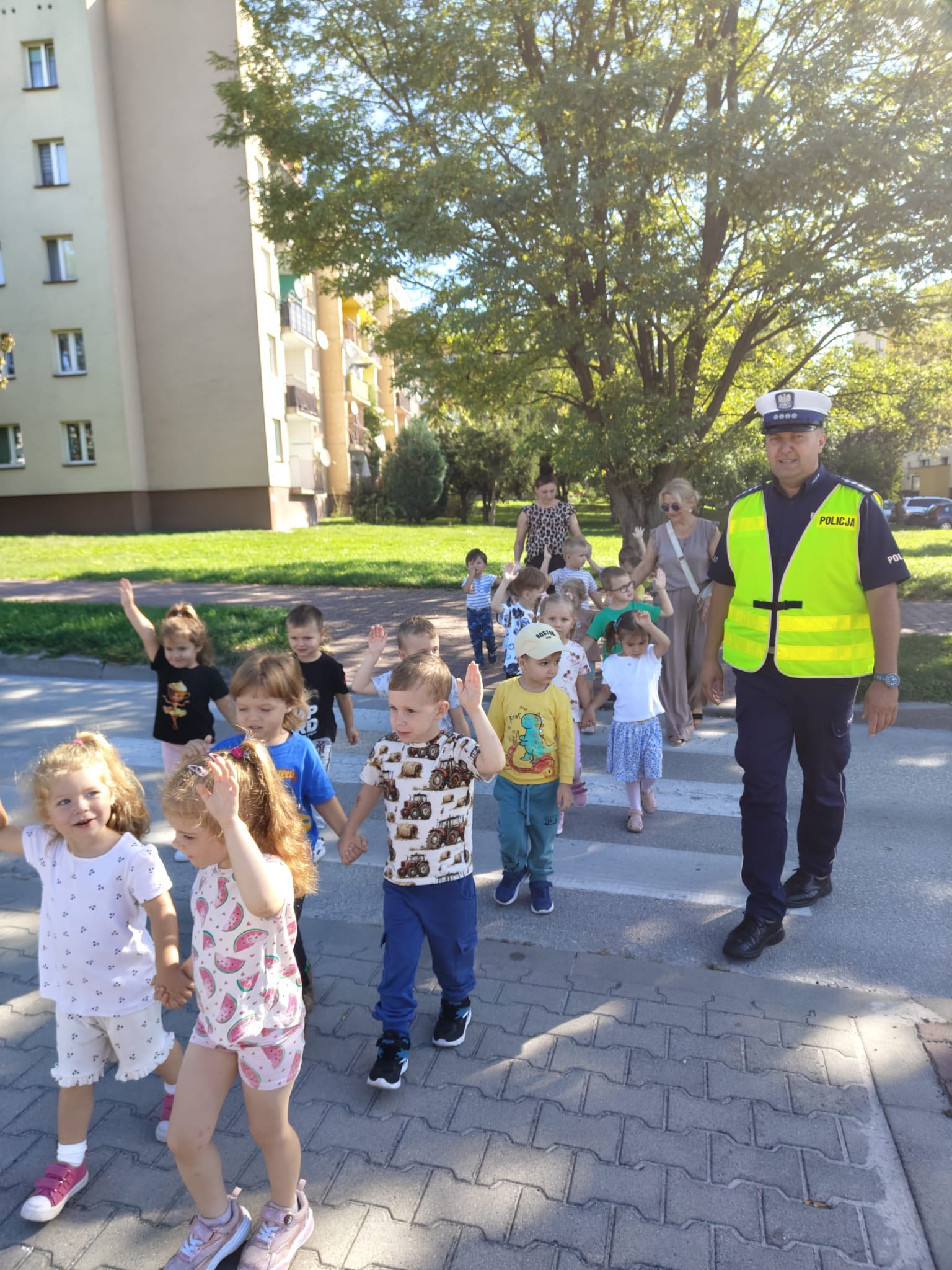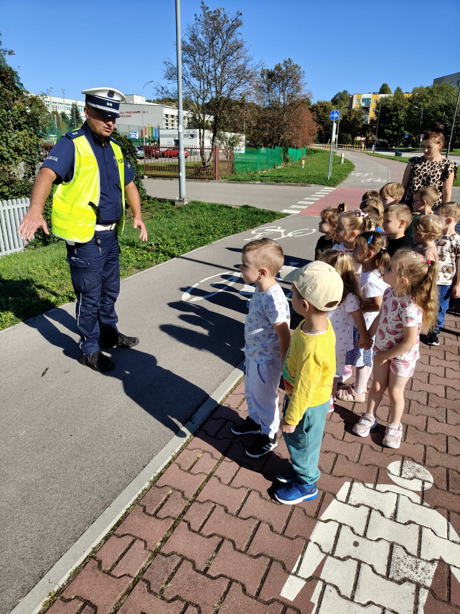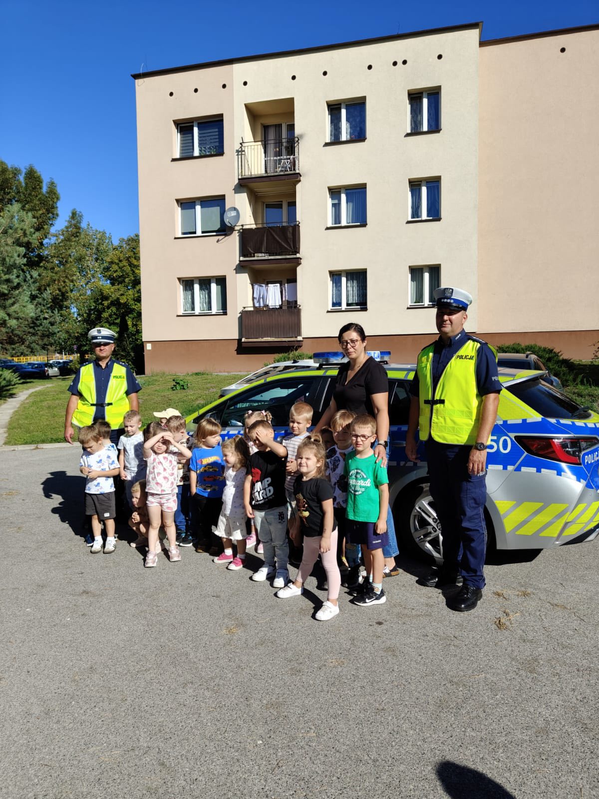 Podczas spotkania dzieci dowiedziały się, jak ważne jest przestrzeganie przepisów ruchu drogowego oraz bezpieczne przechodzenie przez ulicę 🚦. Wspólnie z naszymi gośćmi mogły sprawdzić swoje umiejętności w praktyce, utrwalić znajomość znaków drogowych, a także z bliska obejrzeć radiowóz 🚔 – co wzbudziło ogromne emocje!