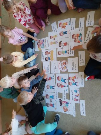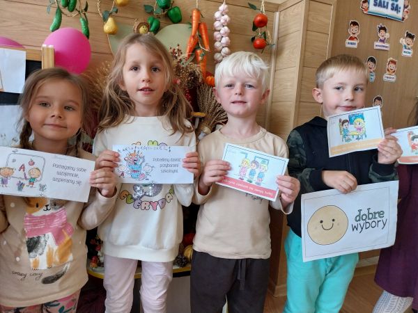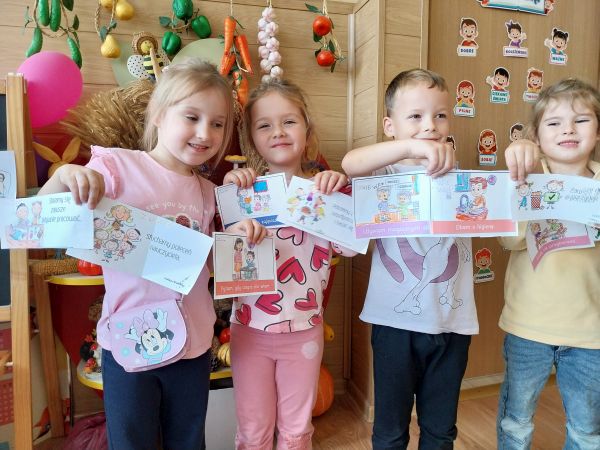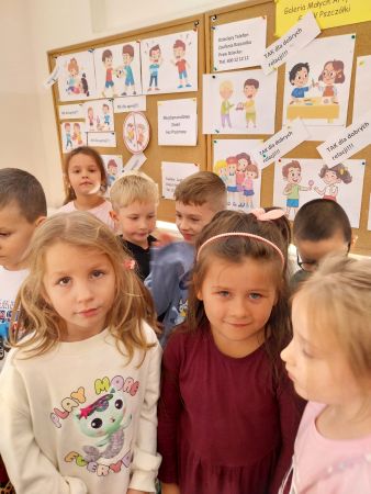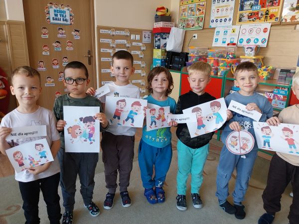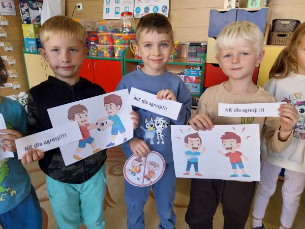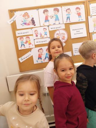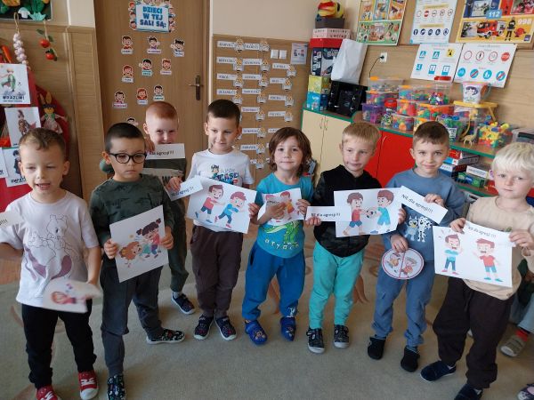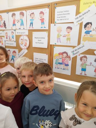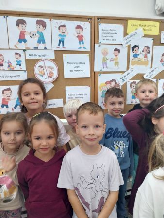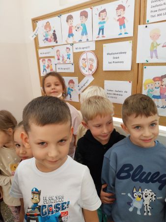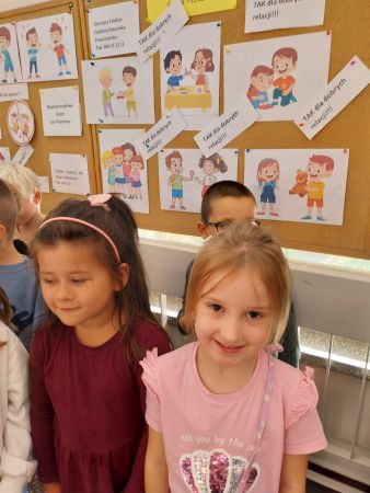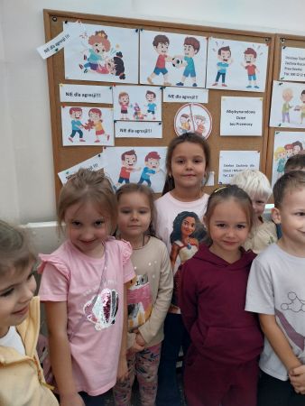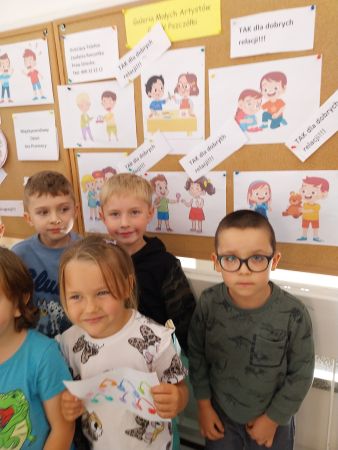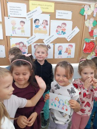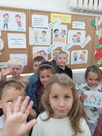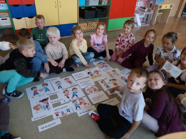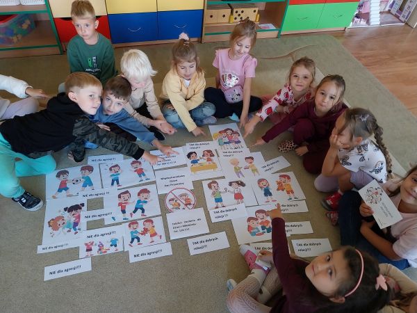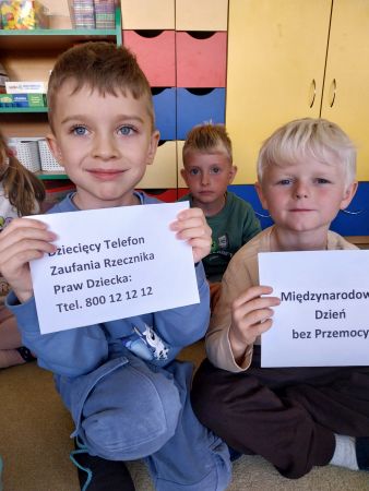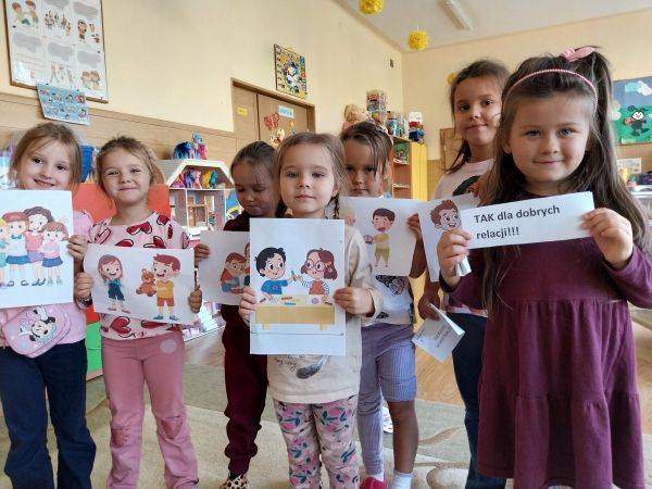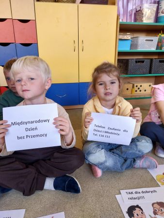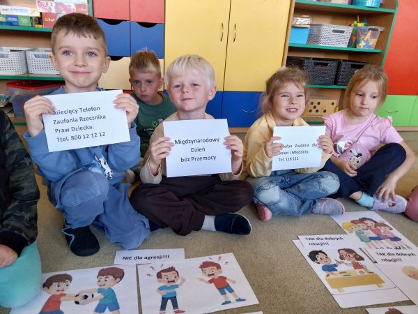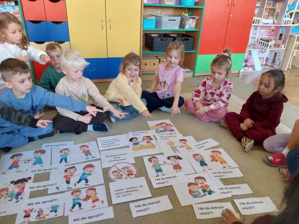 Tydzień Budowania Relacji, Międzynarodowy Dzień bez Przemocy-02.10. to czas rozwijania uczuć empatii. ,,Pszczółki” mówią TAK -dla dobrych relacji, NIE – dla agresji. Poznały instytucję Telefonu Zaufania dla Dzieci i Młodzieży oraz Dziecięcego Telefonu Zaufania Rzecznika Praw Dziecka. Chętne dzieci ćwiczyły na telefonie wystukiwanie ciągu cyfr… Nasze ,,Pszczółki ” pracowały z ilustracjami, doskonale umiały zaproponować zachowania alternatywne do tych pokazanych na ilustracjach. Pracowały z tablicą multimedialną.. . Nasze działania przedstawiamy na tablicy informacyjnej.