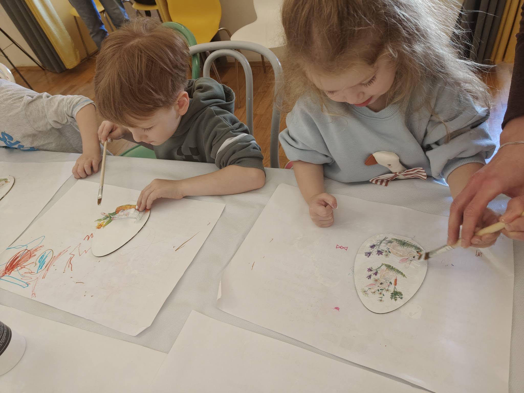 Dzieci z grupy „Motylki” wzięły udział w wyjątkowych warsztatach wielkanocnych, podczas których poznały metodę decoupage. Mali artyści z ogromnym zaangażowaniem ozdabiali wielkanocne jajka pięknymi, wiosennymi motywami – zajączkami 🐰, kurkami 🐥 oraz kwiatami 🌸.